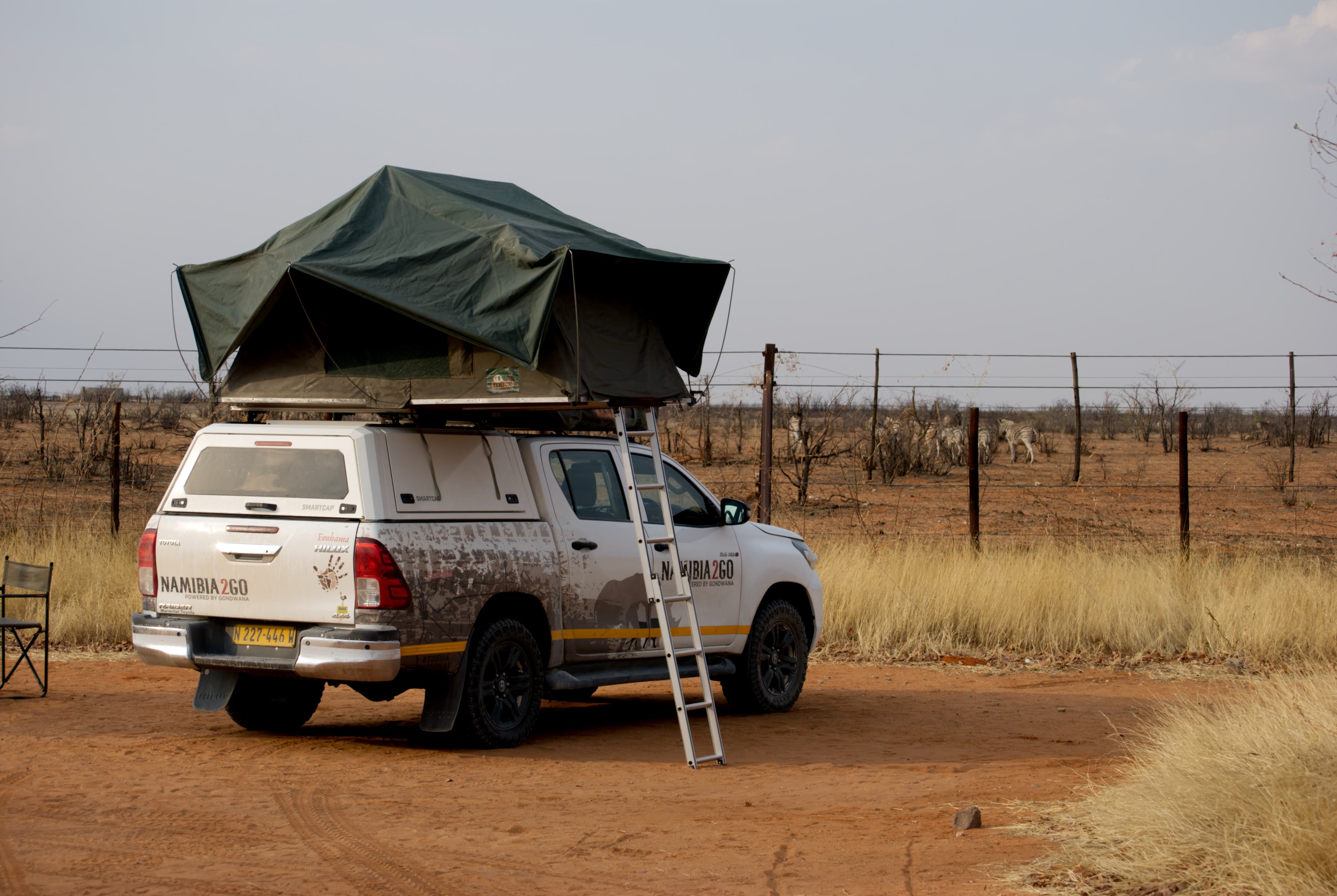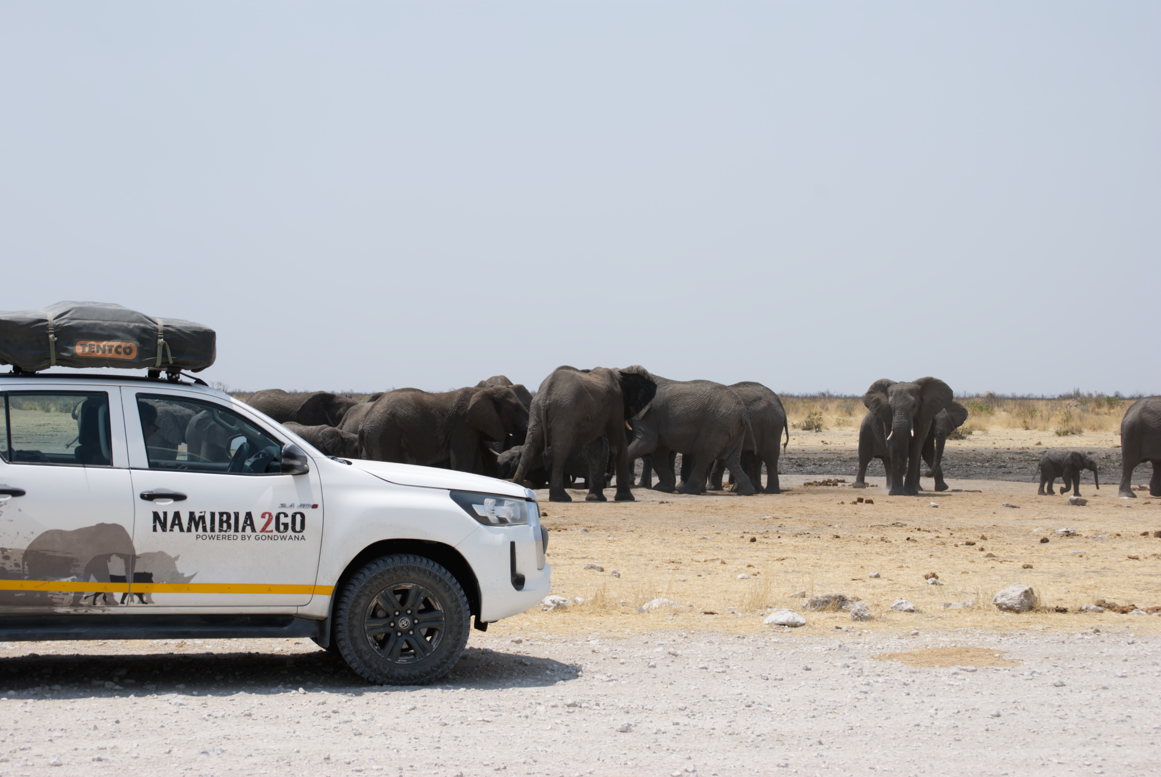 Der Toyota Hilux mitten in Namibia: Giraffen, Elefanten und Zebras begleiten dich auf unendlichen Weiten. Abenteuer, Wildnis und Freiheit – ein Erlebnis, das dich mitten ins Herz der Natur bringt.